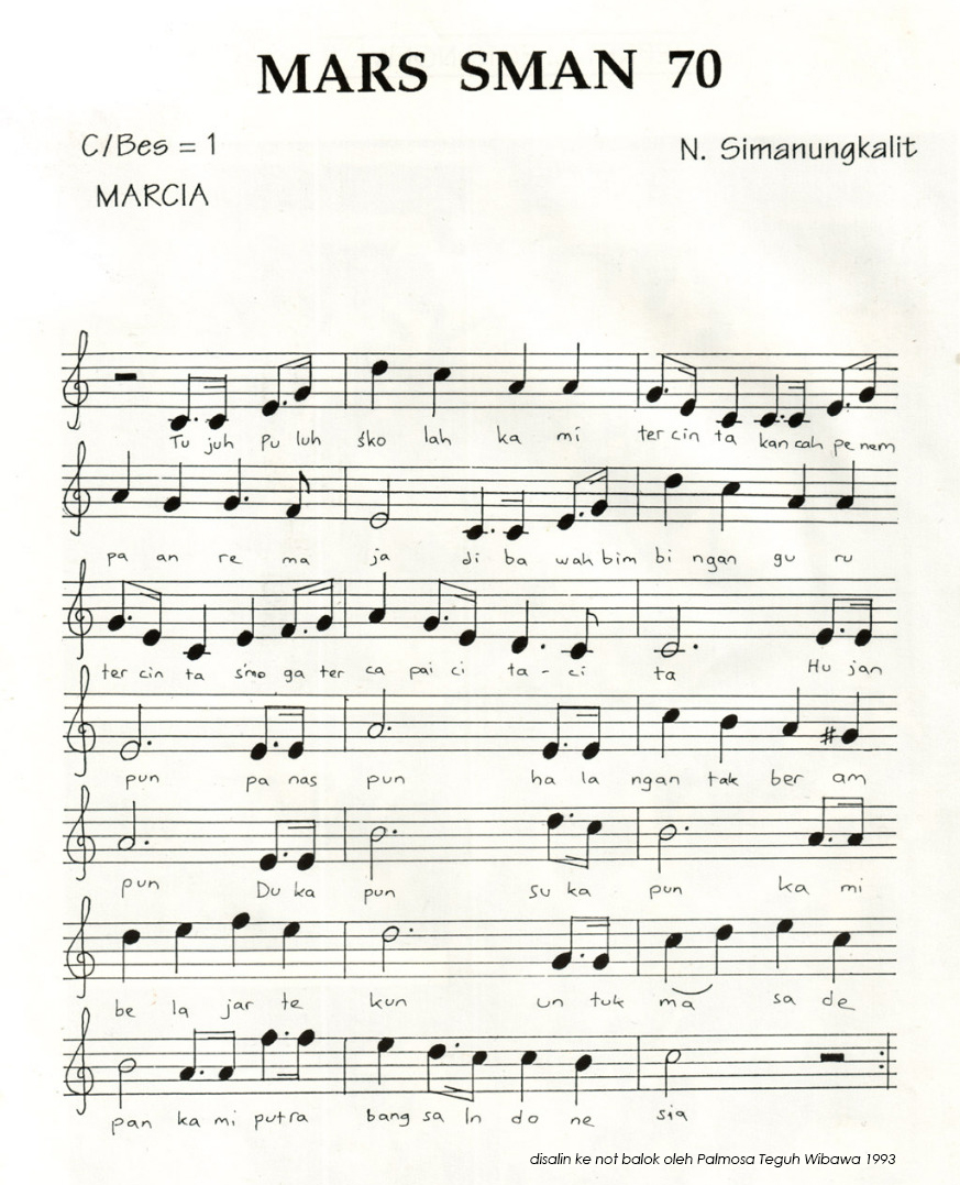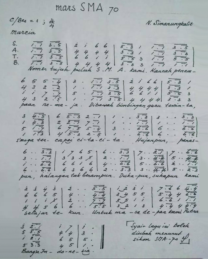 Adalah sebuah kehormatan buat SMA 70, ketika “lagu kebangsaan”-nya diciptakan oleh sang maestro lagu-lagu hymne dan mars perjuangan ini. Dan komposisi lagu mars itu, adalah bagian dari 300an komposisi musik yang telah dilahirkan mendiang N. Simanungkalit.
