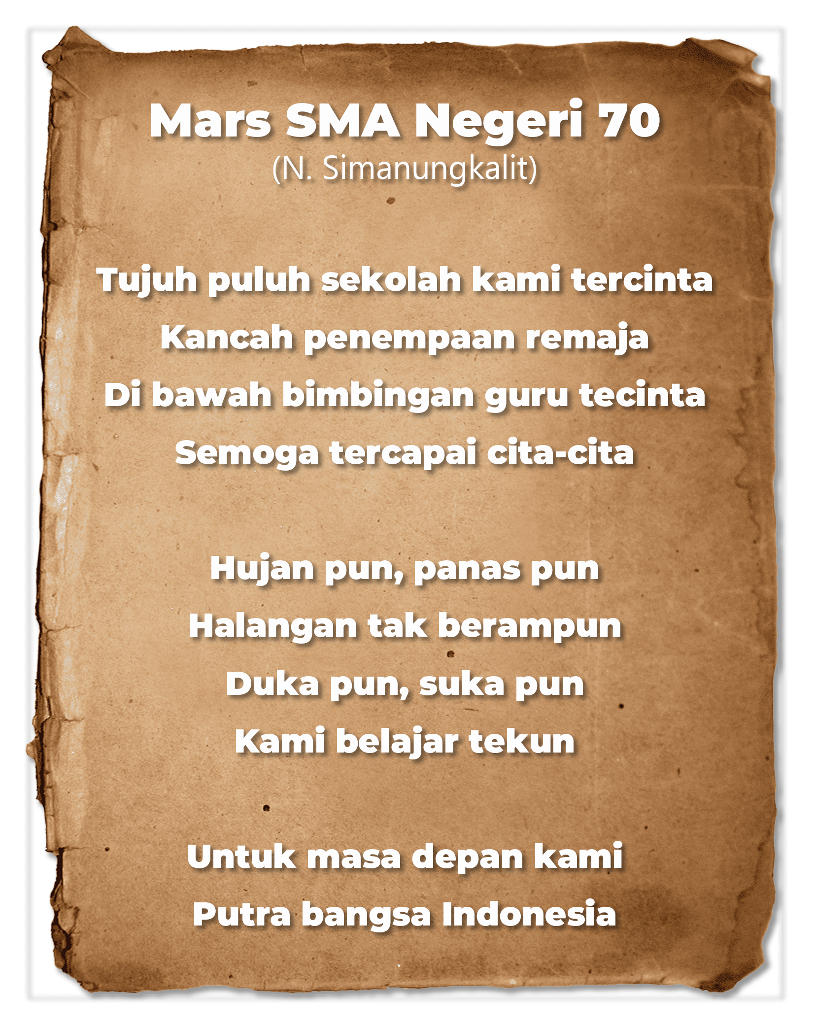 LAGU MARS SMA 70 ini digagas kepala sekolah SMA 70 Jakarta, Drs. Joelioes Joesoef. Yang menjabat sebagai “nakhoda ke-dua” pada 1985 – 1992, melanjutkan estafet kepemimpinan “sang pionir SMA 70” alm. Drs. Darmadi (1982-1985).